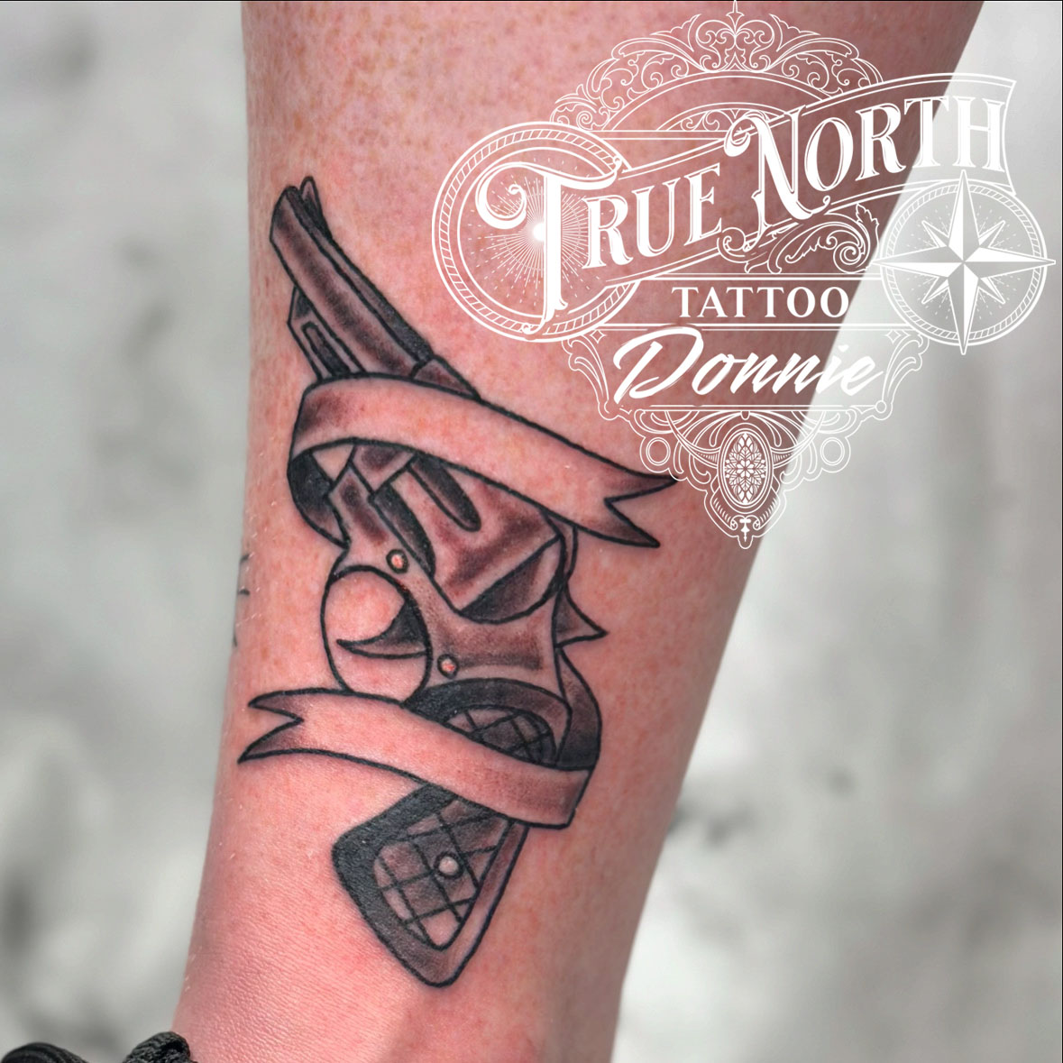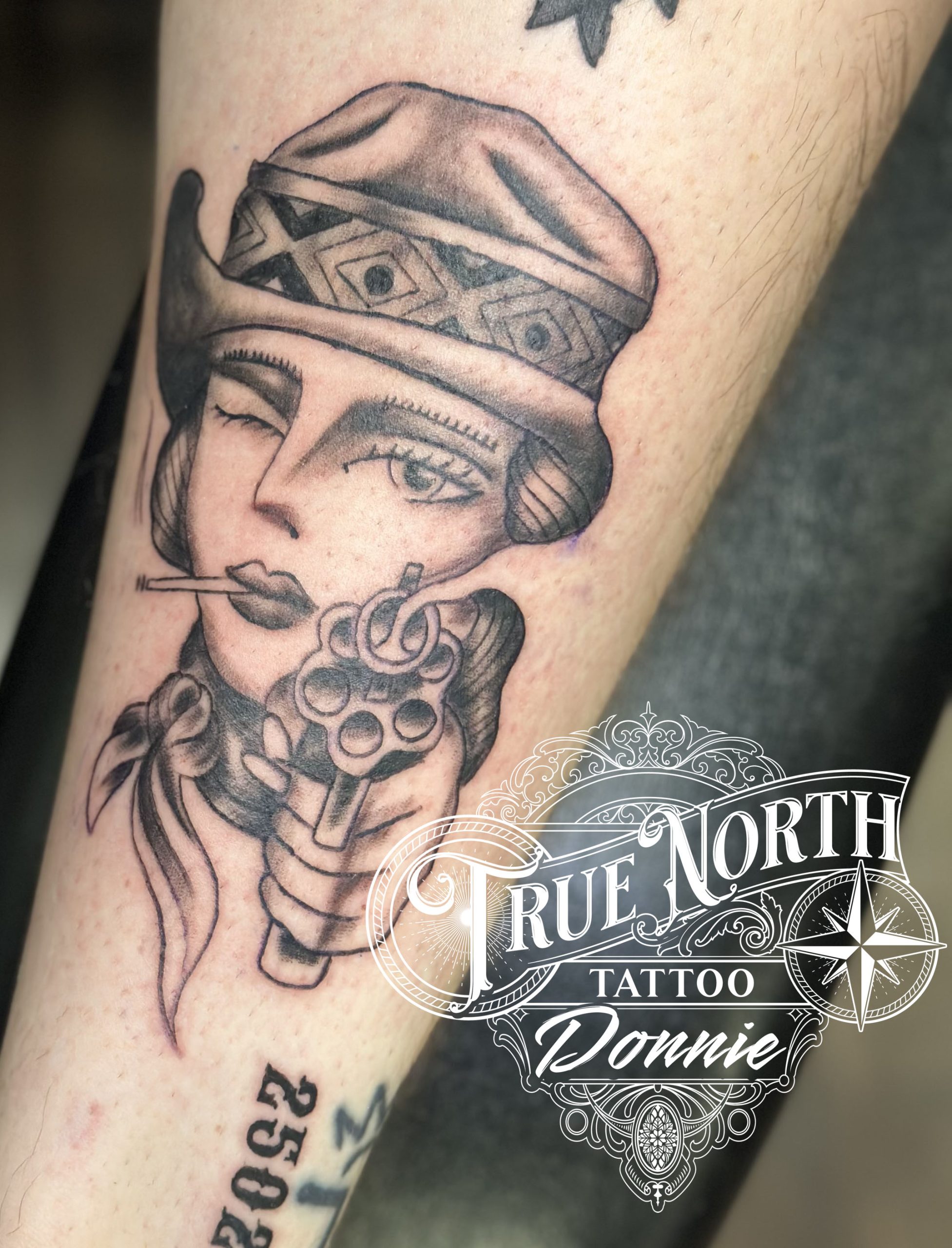 Donovan - Black and Grey American Traditional Woman with Revolver